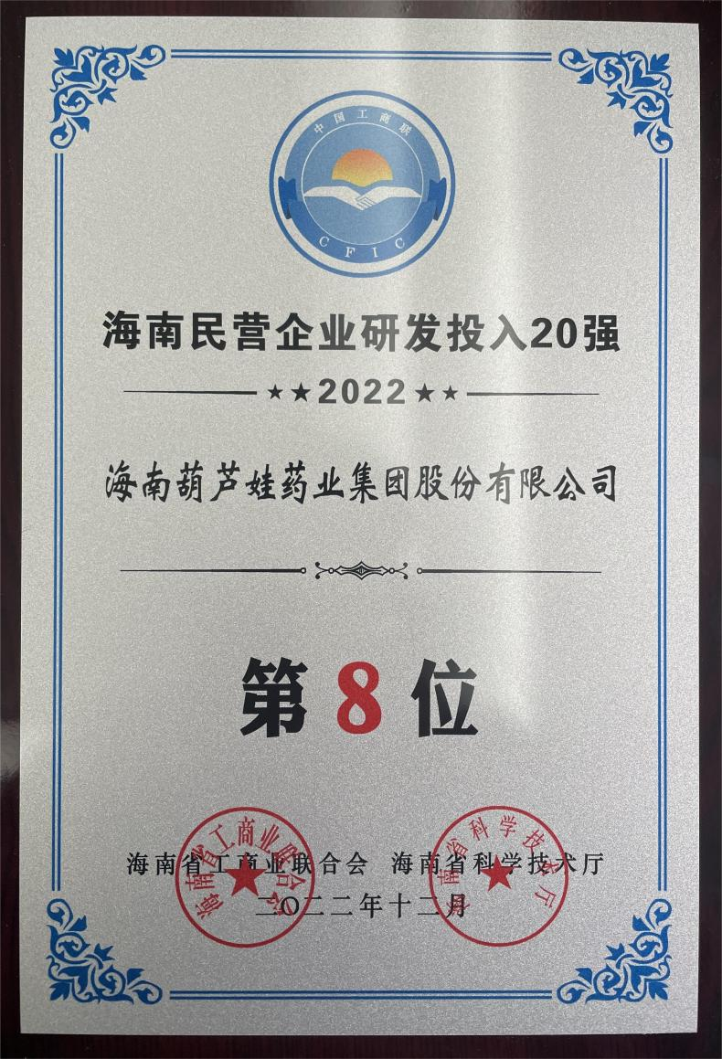 12月23日,2022海南民营企业50强和研发投入20强发布会在海口举行。会上发布了“2022海南民营企业50强”“2022海南民营企业研发投入20强”榜单和分析报告。CA88药业再次荣登两榜,在海南民营企业50强榜单中位列第25位,较去年上升8位,这也是公司连续三年登榜;在海南民营企业研发投入20强中位列第8位,较去年上升7位。