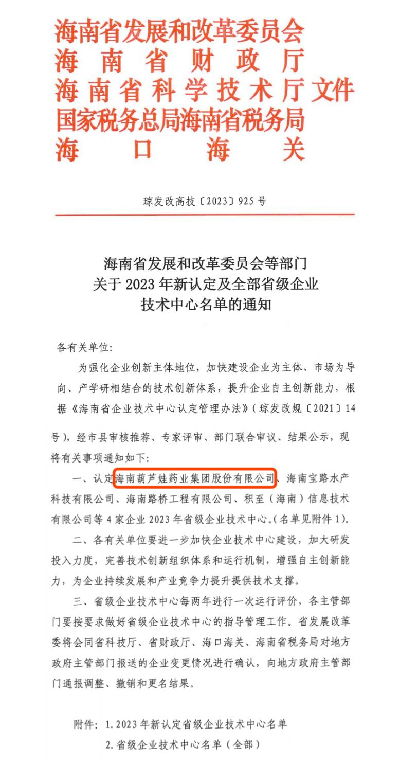 近日,海南省发改委等多部门联合公布了《关于2023年新认定及全部省级企业技术中心名单的通知》,其中,海南CA88药业集团股份有限公司成功通过评审,被认定为省级企业技术中心,是本次获批的4家企业之一。